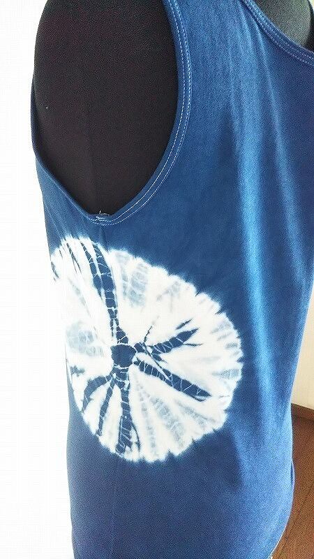 ☆藍色のタンクトップに絞りをポイントに入れ、柔らかなオーガニックコットンの風合いを残しております。本藍染なので、高級感があります。